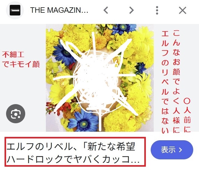 どうしても御自分のお顔を世間にさらしたいのなら御自分のお名前(ペンネーム・ハンドルネーム)でお願いします。私の愛する「エルフのリベル」を汚さないで下さい。嫌がらせも大概(たいがい)にしないと不幸になりますよ!日々幸せに暮らすおばあちゃんのエルフのリベルからの優しいメッセージです